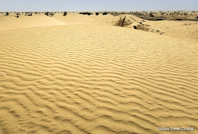 タリム盆地の中心に位置し、東西1,000㎞、南北400㎞、面積33万k㎡、中国の砂漠の43%を占める大砂漠、タクラマカン。アフリカのサハラ砂漠に次いで世界第2位の規模があり、砂丘の高さは70~80m程、高いものでは250mにも達します。昼夜の寒暖の差が激しく、極度に乾燥した過酷な環境のタクラマカンは、いにしえより人々から怖れられていました。隊商や旅人は出発前に何度も沐浴し、深く祈りを捧げて神に加護を求めると同時に、家族に別れを告げたといわれています。それゆえに、ウイグルの言葉でタクラマカン(一度入ったら二度と出られないの意)と呼ばれるようになったとされています。