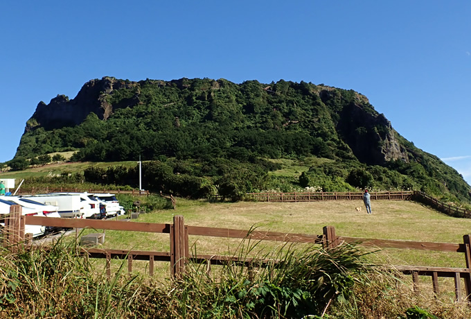 朝、専用車にて城山浦(ソンサンポ)へ。着後、 15分ほど船に乗り牛島(ウド)へ。玄武岩由来の黒い砂が特徴的なコンモレ海岸、紅藻類が生理過程で炭酸カルシウムを蓄積し、石のように硬く固まったものが覆う珊瑚海水浴場を訪れます。その後、済州島に戻り約5,000年前起きた水中マグマ噴火によってできたタフコーン(砕屑丘)・城山日出峰を見学します。