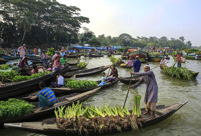 専用バスにてダッカへ戻ります。途中、水上マーケットを訪れ、水上市場の風景を撮影します。夕食後、空港へ。 機中泊