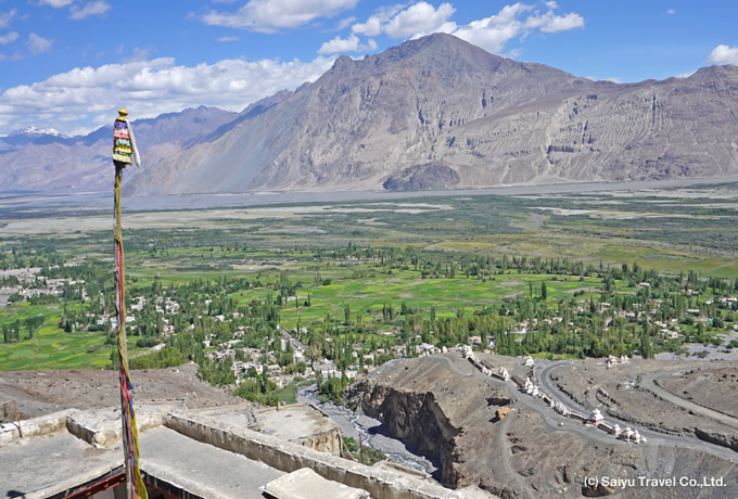 ディスキット僧院から望む緑鮮やかな夏のヌブラ谷