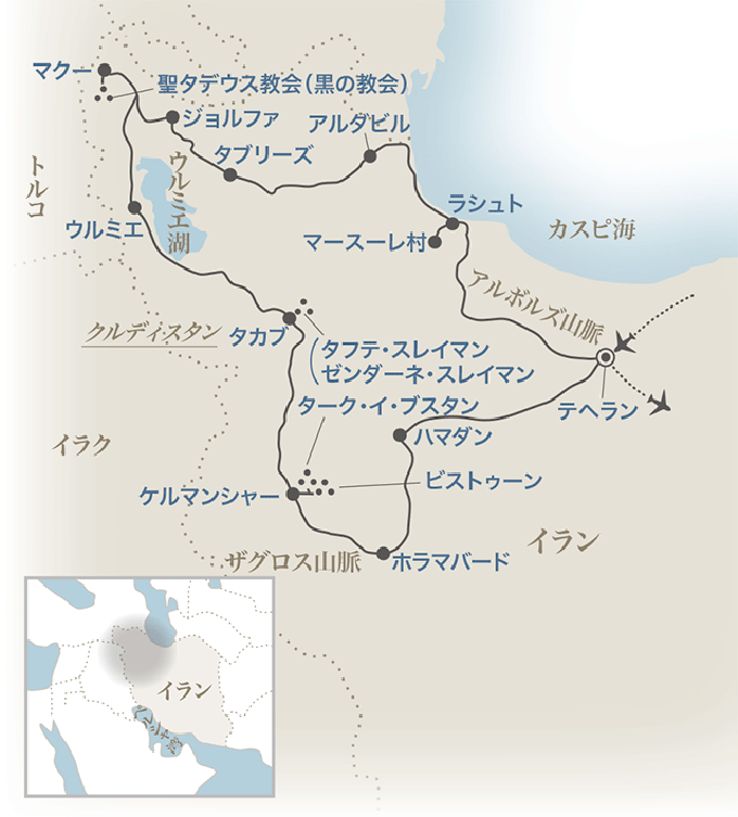 古来よりメソポタミア、アナトリア、コーカサスへと抜ける重要拠点であったこの地域には、この地で興亡を繰り返してきた歴代王朝の貴重な遺跡が数多く残っています。ビストゥーン、タフテ・スレイマンの遺跡群に加え、アルダビルの聖者廟やアルメニア人修道院群などの宗教的史跡と、シルクロードの要衝タブリーズのバザールの5つの世界遺産を巡ります。アルメニア人修道院は、世界遺産に登録されているゾルゾル教会、タデウス教会、聖ステファノス修道院の3つ全てを見学します。ポイント 数々の歴史遺産を見学
