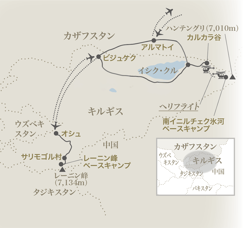 ヘリフライトにて天山山脈の南イニルチェク氷河に着陸。名峰ハンテングリ、キルギス最高峰ポベーダを望むBCに宿泊します。世界の登山家が集うBCの雰囲気や氷河上のキャンプ体験、天山の雄大な山岳風景をお楽しみいただきます。