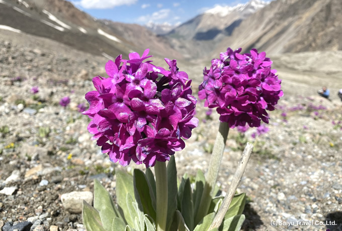 四輪駆動車に分乗し、サリジャズ渓谷の風景を楽しみながらチョン・アシュ峠(標高3,822m)へ。チョン・アシュ峠の周辺では、息をのむような絶景とともに白いキンポウゲの花・トロリウス・リラキヌスなど高山植物の観察も楽しみます。その後、カラコルへ戻ります。