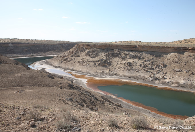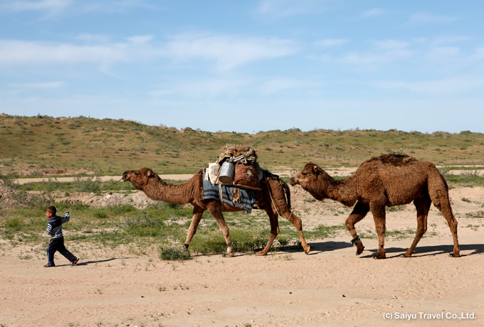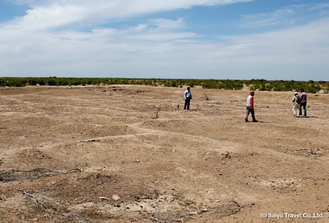 太古の昔、アム・ダリヤ河はカスピ海に直接注いでいましたが、時代と共に流れを変えてアラル海につながりました。その後、アム・ダリヤ河から水路を引きサリカミシュ湖を経由してカスピ海まで繋げたのがウズボイ水道です。この水道を通って北東のホラズム地方からの物資がカスピ海へ運ばれ、9日間かけて対岸のコーカサス地方に渡りました。その後物資は陸路で黒海まで運ばれ、再度海路でコンスタンティノープルやヨーロッパへと運ばれていきました。この事実を裏付けるように、ウズボイ水道周辺からは船や錨のレリーフが発見されています。ツアーでは、ウズボイ水道に残るイクディ・カラを訪れます。ここへ陸揚げされた物資は、陸路南のペルシャへと運ばれたと思われます。