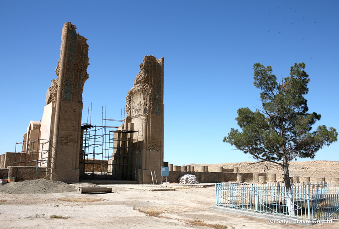 ダヒスタンは、13世紀のモンゴル襲来まで栄えた隊商都市で、「ダヒ」とは首長という意味と、パルティアの始祖のパルニ部族の流れを持つ「ダヒ」という部族名との説があります。現在残る遺跡には、12世紀の聖人の廟と、その回りに他の28の廟が点在しています。また、かつてのダヒスタンの首都・マシャド・ミスティアンに残る大きな城壁址の内部には、キャラバンサライの跡と巨大な金曜モスクが残ります。チンギス・ハーンはあまりの巨大さに、このモスクと2本のミナレットだけは破壊せずに過ぎ去りました。モスクは門の一部が残っており、かつて交易で栄えた隊商都市の巨大さがよくわかります。