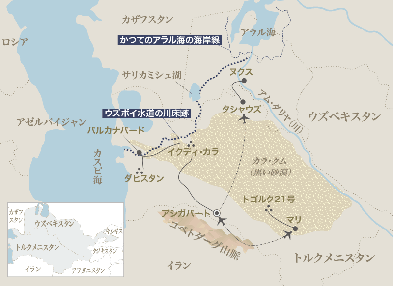 かつてアム・ダリヤとカスピ海を繋いだウズボイ水道、マルグッシュに残る巨大神殿跡トゴルク21号、中央アジアとペルシャの交易路上にあったダヒスタン等、トルクメニスタンに残る貴重な史跡群を訪問。