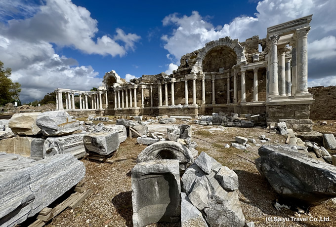 紀元前1000年にギリシャの植民都市として建設された、パンフィリアの主要都市。ローマ帝国の時代に最盛期を迎え、ローマ劇場や水道橋が建設されました。ローマ皇帝マルクス・アウレリウスの命により建設された直径95mの小アジア最大の円形劇場は、ほぼ完璧な姿で残っており見る者を圧倒します。