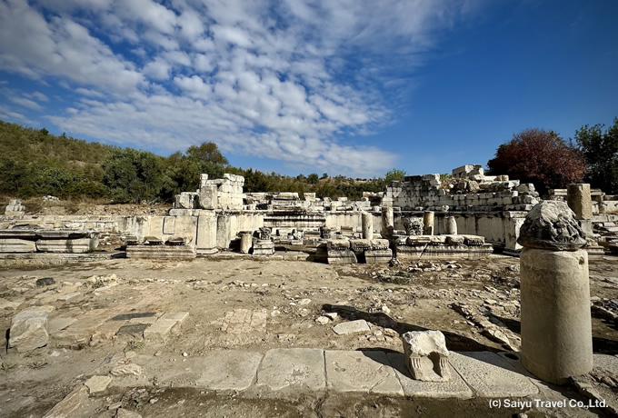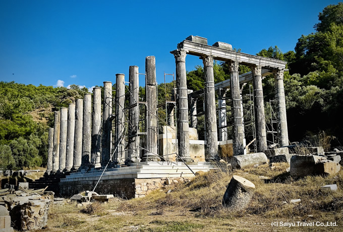 専用バスにて地中海とエーゲ海の出会う町ボドルムへ。途中、セレウコス1世の妻の名前を冠したストラトニケア遺跡、ラブラン(ミラス)の遺跡、ギリシャ時代のゼウス神殿の残るエウロモス遺跡、紀元前3千年紀に建設された古代ギリシャ都市跡のイアッソスを見学します。