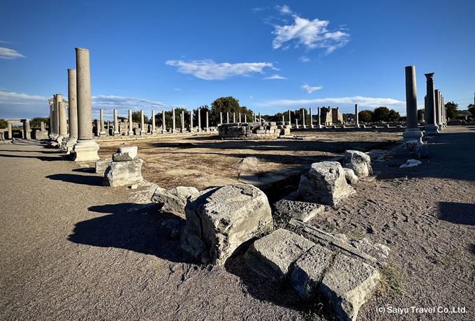 着後、航空機を乗り換えて、アンタルヤへ。着後、パンフィリア地方に残る遺跡群を見学します(イオニア人の都市遺跡シデと隣接するシデ博物館、小アジア最大の劇場跡の残るアスペンドス、原始キリスト教の拠点で聖パウロも説教をしたペルゲ遺跡)。