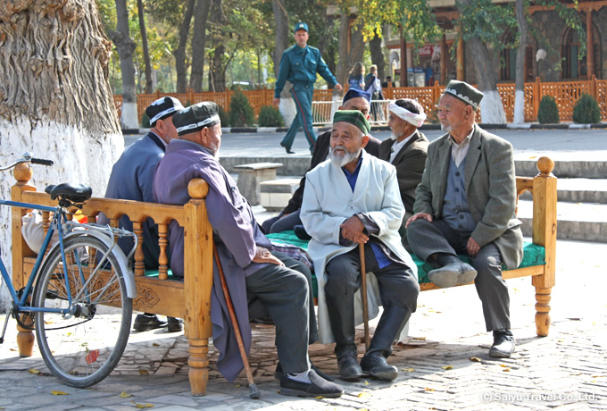 ウズベキスタンは、シルクロードのオアシスルートのちょうど中央に位置し、古くからキャラバンが行き交った東西交易の要衝として栄えました。現在でも、バザールにはシルクロード情緒あふれる風景が残り、街中では伝統的な帽子ムンコイを被ったおじいさんたちが語らう姿や、青いタイルに飾られたモスクなどの伝統建築を見ることができます。