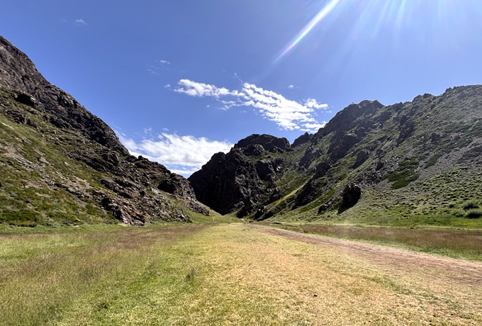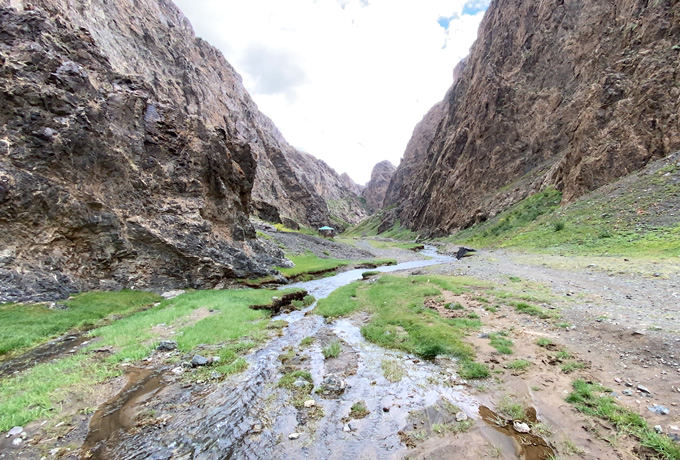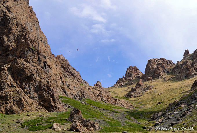 「ヒゲワシの谷」と呼ばれる深い渓谷ヨリーンアムは、侵食作用によって長い年月をかけて刻まれたもので、細く狭い切れ込みのような地形が特徴です。標高約2,800メートルの高さにあり、日照が谷底まで届きにくいため冷気がこもりやすいく、夏でも岩陰に氷が残ることがあります。こうした地形的条件が重なり、砂漠の中にありながら氷河谷のような景観が見られるという、非常にユニークな環境が保たれています。運がよければ、頭上を旋回するワシ類や、斜面の巣穴から顔をのぞかせるナキウサギなど、砂漠の中に息づく野生動物の姿を観察することもできます。