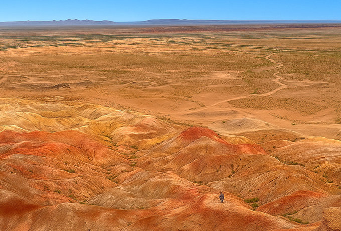 モンゴルをイメージする景観といえば、広大な草原と砂漠です。南ゴビへの道では、見渡す限りの草原が広がり、どこまでも続く一本道が地平線まで伸びます。山脈を越えると、幅20kmにも及ぶ広大な砂漠が姿を現します。テレビドラマで一躍脚光を浴びたモンゴルの大自然、まだ訪れる人の少ない絶景、ヘルメンツァブまで足を延ばします。