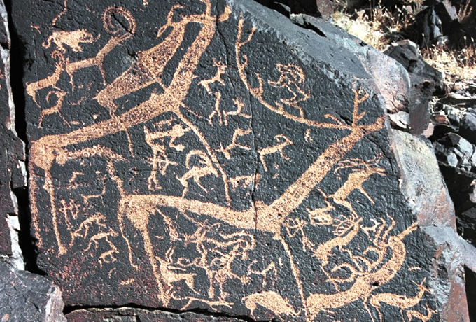 朝、ガルバンサイハン山脈を越えてハフツガイドへ。1万年前頃から書かれた動物や生活様式などの岩絵を見学。世界で初めて恐竜の卵が発見された、炎の崖・バヤンザグを散策します ダランザドガド:ツーリストキャンプ泊 |