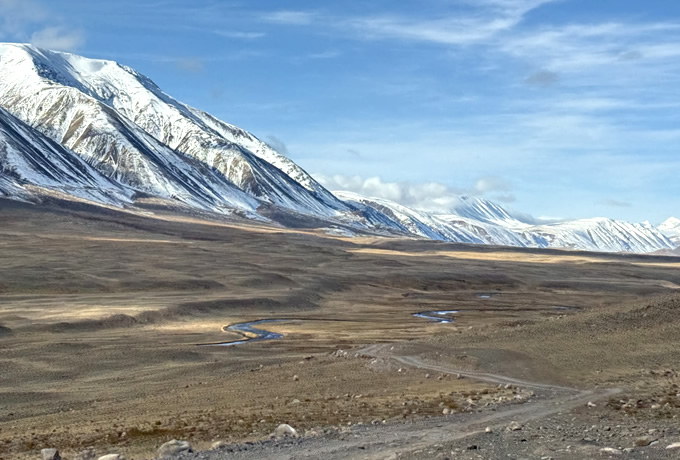 雄大なアルタイ山脈の“氷河”こそ、この乾いた大地に多くの湖を生み出した源です。かつて巨大な氷河が谷を削り取り、深いU字谷や窪地を形成しました。氷が運んだ岩石はやがて天然の堤防となり、そこへ雪解け水や氷河融水がたっぷりと流れ込んで湖へと姿を変えました。夏でも山には雪渓が残り、澄んだ水が絶え間なく注ぎ込みます。さらに、この地域は乾燥地帯特有の閉じた盆地が多く、河川が外へ流れ出にくいことも湖が長く残る理由のひとつです。こうして大自然が幾重にも重ねてつくり上げた湖は、エメラルド色や深い群青色に輝いています。