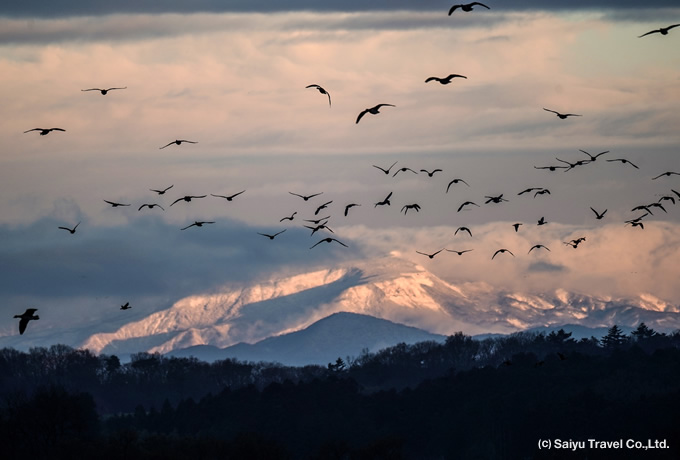 10月の下旬頃から伊豆沼・蕪栗沼に飛来するガンの群れ、11月下旬頃にはその数は十万羽にも達します。ツアーでは、登米に2連泊し、越冬地となっている伊豆沼・蕪栗沼・化女沼(いずれもラムサール条約登録湿地)などでガンの観察。朝焼けのガンの飛び立ち、夕方の塒入りはそれぞれ2回のチャンスを設けています。