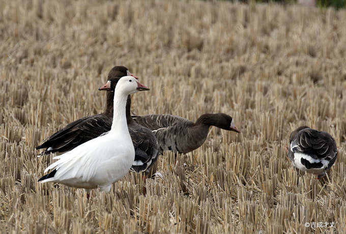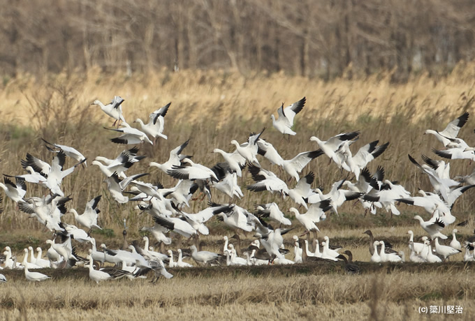絶滅危惧種に指定されているハクガンは、復活プロジェクトの成果で数も回復してきており、秋田県八郎潟の大潟村周辺では1,000羽以上のハクガンが観察されています。朝焼けのガンの飛び立ち、夕方の塒入りも観察します。