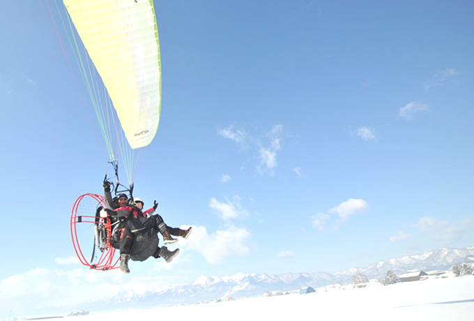 白銀の富良野を上空から一望するモーターパラグライダーを体験します。空中散歩をお楽しみください。