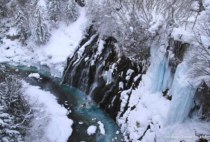 美瑛の白髭の滝と青い池は、別名ブルーリバーと称される美瑛川の美しい流れが作り出す名勝です。 冬になると真っ白な雪化粧に覆われ幻想的なライトアップされた景観をご覧いただけます。