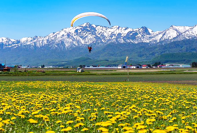 富良野ではモーターパラグライダーから十勝連峰の山々や眼下に広がる大自然を上空から望みます。 パイロットとのタンデム飛行なので、初めてでも安心して楽しめます。