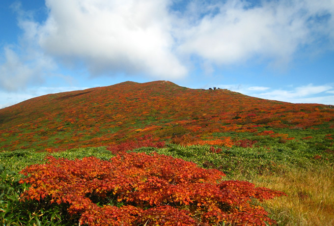 宮城、秋田、岩手にまたがる山で、山頂部は宮城県と岩手県の県境になっています。宮城県側に現れる馬の雪形が山名の由来。奥羽山脈の女王と呼ばれ、花も紅葉も美しい山です。随所に高層湿原や雪田草原が発達し、夏には可憐な高山植物が咲き乱れ「花の百名山」のひとつに数えられています。また、ブナやミズナラ、カエデ類等の落葉広葉樹林が広がっており、秋には山全体が赤・黄・橙・緑の原色に彩られ、神の絨毯、日本一の紅葉と称されます。『日本百名山』の深田久弥氏も、そのあとがきで「栗駒山も百名山に入れるべきであったかもしれない」と記しているほどの名峰です。また、周辺一帯は栗駒国定公園に指定されており、総面積は771.4平方kmに及ぶ大規模な山岳国定公園となっております。
