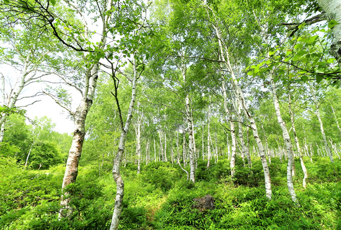 日本一の白樺林が広がる自然園で、白樺や山野草の花を楽しみながら歩きます。途中、青く透き通る湖「遊亀湖」(ゆうきこ)があります。