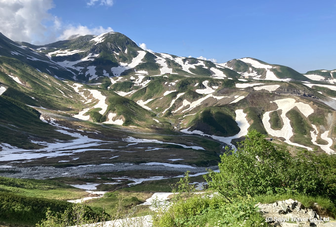 11:30JR富山駅集合。徒歩で電鉄富山駅に移動し(2分)、列車にて立山駅(475m)へ。車窓からは薬師岳や剱岳等、雄大な立山連峰の姿をお楽しください。着後、立山黒部アルペンルートをケーブルカーと高原バスで乗り継ぎ、室堂平(2,450m)へ。着後、立山室堂山荘へ。(約15分)