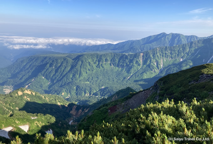 チングルマ、ミヤマキンバイ、ハクサンイチゲ、コイワカガミ、コバイケイソウ等、山々を彩る高山植物のベストシーズンを歩きます。縦走中は、ガレ場やハシゴ、鎖場など荒々しい場所もありますが、そんな中で随所に現れるお花畑には奥ゆかしい魅力があり、尾根から望む風景と共にとっておきの姿を見せてくれます。特に多くの人々で賑わう室堂・立山を出発し、険しい道を越えた先に広がる溶岩台地“五色ヶ原”は、青々とした草原地帯になっており、お花畑と池塘が点在する別世界。何度訪れても素晴らしいまさに雲上の楽園です。