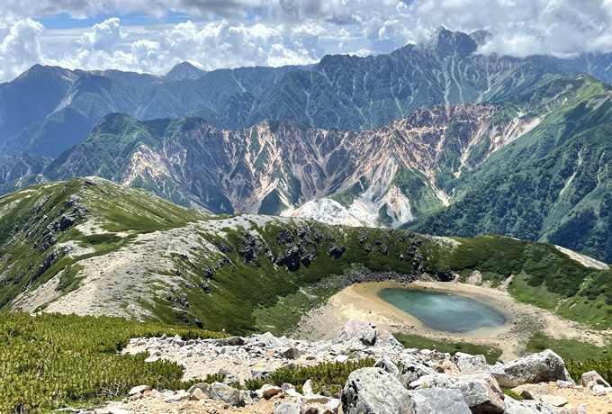 朝発 | ●北アルプス縦走(コースタイム5時間30分) 黒部五郎小舎から裏銀座ルートに合流します。三俣蓮華岳まで登ると、眼前に鷲羽岳が聳えます。三俣山荘から急登を行き鷲羽岳(2,924m)に登頂、天候がよければ鷲羽池も見られます。岩稜をたどり、ワリモ岳を越えると水晶岳と雲ノ平方面への分岐にあたります。そこからは伸びやかな景色の中、水晶小屋(2,890m)へ。 水晶小屋泊|食事:朝○ 昼○ 夜○