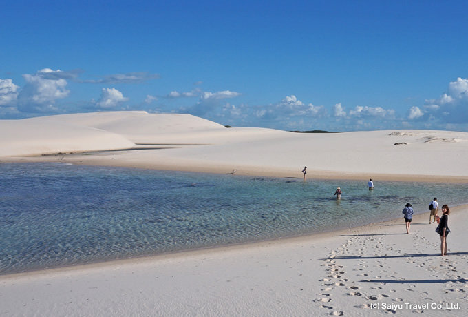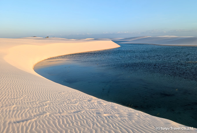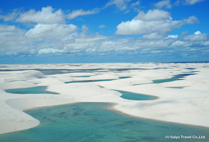 ポルトガル語で「シーツ」を意味するレンソイスは、その名の通り石英で出来た真っ白な砂丘が東京23区の約2.5倍の大地に延々と広がっています。雨季の後、この砂丘には無数の神秘的な青い湖が現れ、真っ白な砂丘との美しいコントラストをお楽しみいただくことができます。このツアーでは1日かけて、国立公園に指定されている大レンソイスだけではなく、その東側にある小レンソイスも訪問します。さらに陸からだけではなく、遊覧飛行で空からも幻想的な風景をご覧ください。