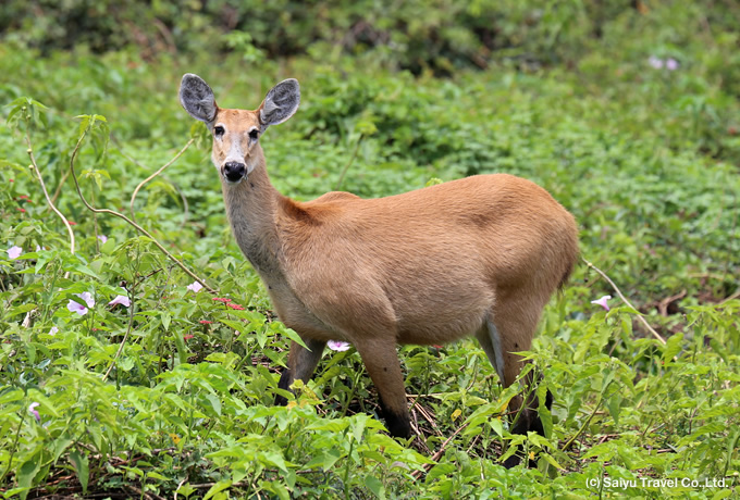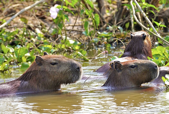 日中のサファリでは、愛らしい姿のカピバラやメガネカイマン、 オオカワウソやアナコンダにも遭遇することがあります。また、ツアーではポルトジョフレまで足を運び、 ネコ科の動物として最大の大きさを誇るジャガーの観察を楽しむボートサファリもご案内します。