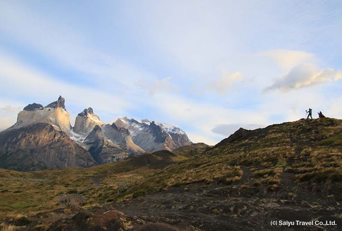 早朝、フィッツ・ロイやセロ・トーレを一望できる展望台を訪れ、朝焼けに染まる名峰群の撮影をお楽しみください。朝食後、専用車にて大草原パンパを走り抜け、国境を越え、パイネ国立公園へ。