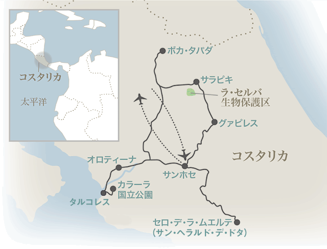 | 気候・服装 | サンホセ、セロ・デ・ラ・ムエルテでは日中は爽やかな気候ですが、朝晩10℃位まで気温が下がりますので防寒着もお持ちください。その他の低地は日中30℃以上にまで暑くなり、夏服で過ごせます。熱帯雨林では雨が降ることもありますので上下セパレート式の雨合羽は必ずお持ちください。 |