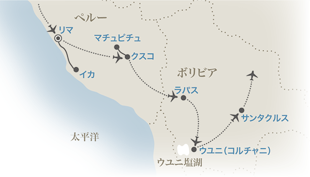 ペルーでは世界遺産に登録されているナスカの地上絵、マチュピチュ遺跡、クスコ旧市街など、プレ・インカからインカ帝国時代に築かれた歴史遺産の数々を見学。クスコから一気に空路でボリビアへと入り、ウユニ塩湖にも2連泊します。ポイント ウユニ塩湖では塩のホテルに2連泊