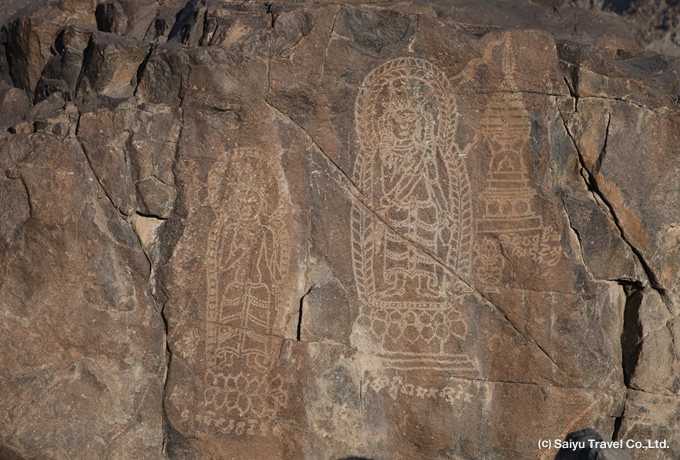 チラスでは2029年のインダス川のダムの完成により失われる岩刻画の一部を見学します。西遊旅行は2021年よりインダス河畔の岩刻画の調査をしています。古のシルクロード、カシミールへの道と繋がるチラスではカシミール様式の仏教モティーフの岩刻画、法隆寺の玉虫厨子にも描かれた「捨身飼虎図」の岩刻画をご覧ください。