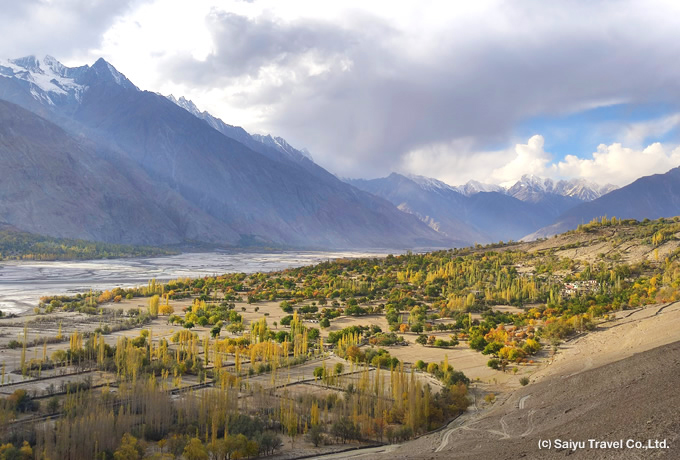 黄金のポプラに包まれたインダス川支流の谷巡り