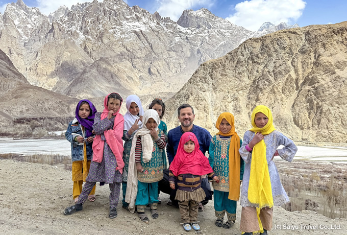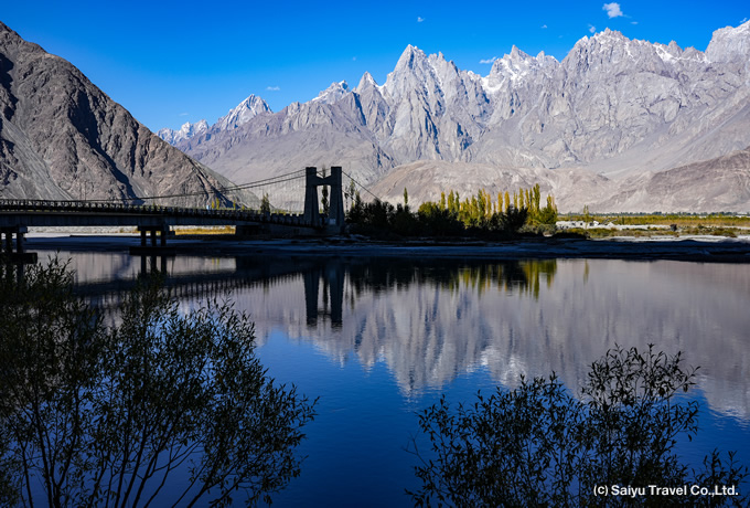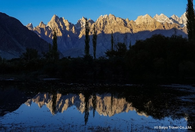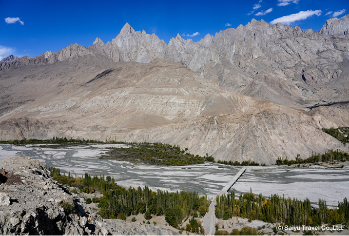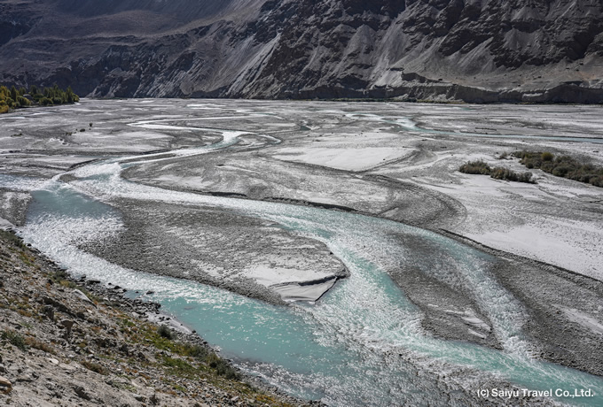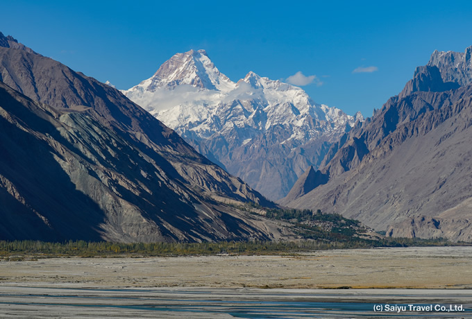 カラコルムの山に囲まれたインダス河畔の町スカルドゥ。そこからさらに1時間走るとK2登山の入口となるシガール渓谷へ入り、バルティ族の暮らす果樹に囲まれた村ハシュピへ到着します。西遊旅行は2025年秋、ハシュピ村にホテル・ハシュピリゾート Hashupi Resortをオープンしました。初夏はまぶしい緑、秋は黄金色に輝くポプラに囲まれ、テラスからは5,000m級の高峰がご覧いただけます。