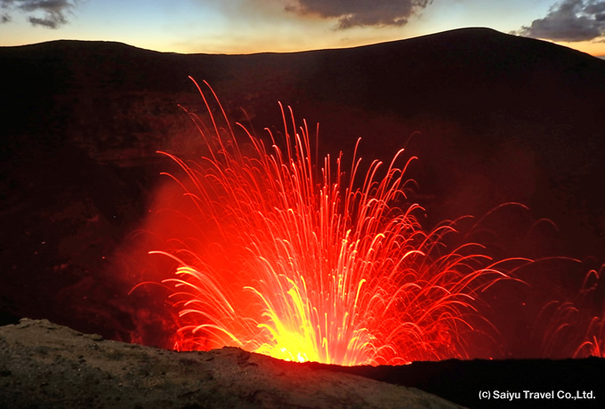夕方から夜にかけて火山を訪れ、火口の淵に立ち、真っ赤な溶岩を吹き上げる迫力の景色をお楽しみいただきます。万が一の悪天候に備えて火山は2回の見学チャンスを設けております。