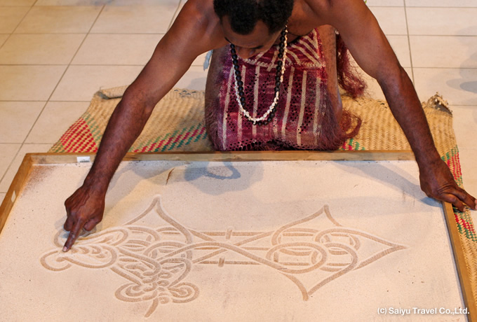 1本の指で入り組んだ形の連続線を作るバヌアツの砂絵。火山灰や砂地が多いため発展した芸術です。絵画としてだけではなく、文字の代わりの通信手段となったり、儀式に用いられたりしてきました。
