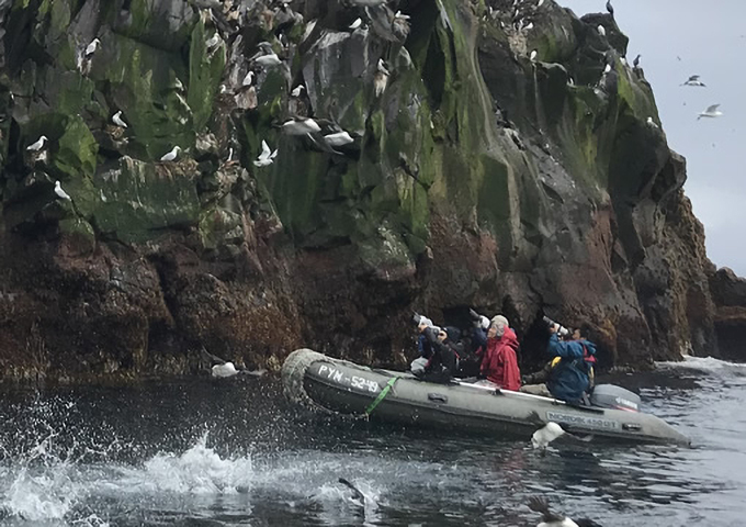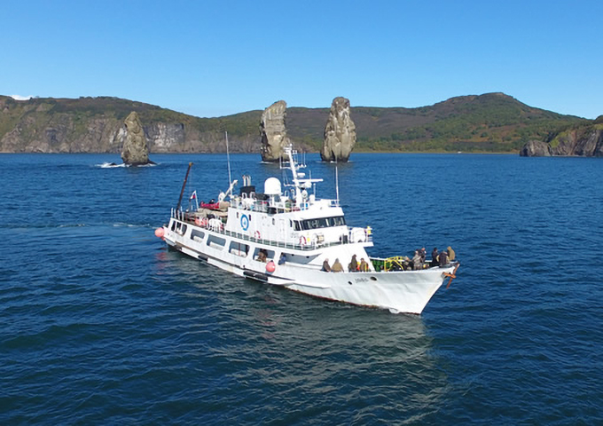 もともと調査などに利用される船で設備は非常にシンプルですが、千島列島やカムチャッカ・コマンドルスキー諸島の海域を熟知した船員、ガイドによるクルーズ船です。大型船では接近もできない島近くの海域も航行し、甲板のどこからでも観察・撮影が可能です。アフィナ号でも近づけない海岸や海鳥のコロニーには、ゴムボートで接近します。