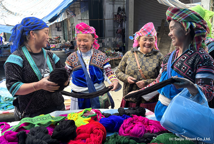朝、白モン族やアオザイ・ザオ族の人々で賑わうドンバンの日曜市を見学。その後、専用車にてハジャンへ。途中、紺色の長い丈の衣装が特徴のアオザイ・ザオ族の村、メオバックで行われる日曜市を訪問。