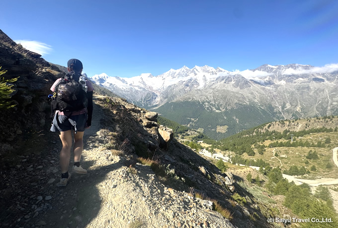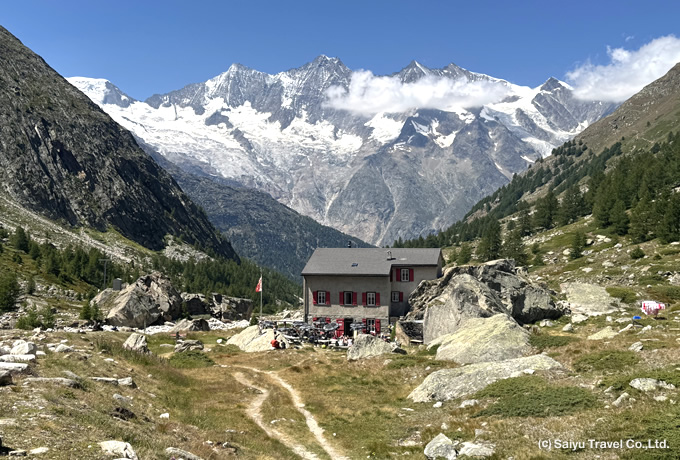 ●ツール・ド・モンテローザ1日目(約6時間) ツール・ド・モンテローザが始まります。朝食後、公共バスでサースグルンド(1560m)へ。着後、ケーブルカーにてクルスボーデン(2,400m)へ。右手にアルプス第3位の高峰ドーム(4,545m)を盟主とするミシャベル山群に囲まれたサースフェーの村を見ながら歩きます。序盤こそ登りですが、トレッキング初日に相応しい緩やかなルートをサースアルマゲル(1,660m)へ戻ります。 <12km 累積登り300m / 累積下り1000m> サースアルマゲル:マットマルク泊