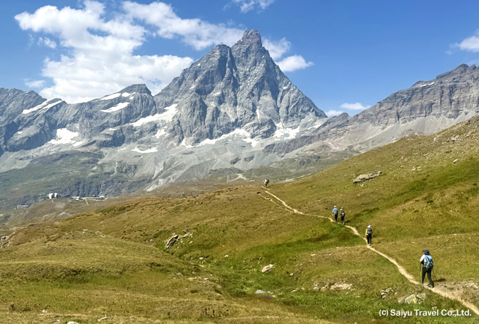 約9時間 | ●ツール・ド・モンテローザ6日目(約9時間) 山小屋から歩き出し1時間弱で、標高差約1400mの登り返しに入ります。下ってマッターホルン南壁を望む町、チェルビニア(2,050m)へ。ホテルはプラン・メゾン(2,555m)の好展望地に位置しています。 <17km 累積登り1200m / 累積下り750m> プラン・メゾン:ロ・スタンベッコ泊