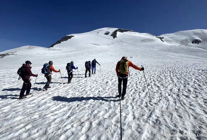 氷河上を歩いて、ブライトホルンの頂を目指します。山岳ガイドが同行し、ロープをつないで行動します。 ロープをつなぐハーネスやアイゼンなどは現地でレンタルが可能です。