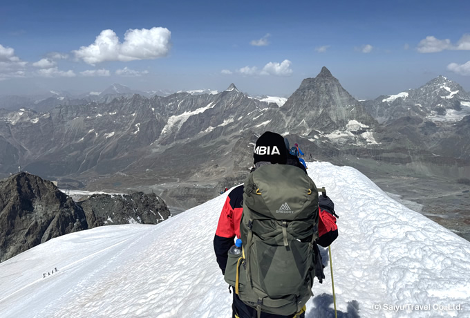 初めての4,000m峰登頂にも最適な山です。氷河歩きや一部、傾斜約35度の急斜面もあるためアイゼンは勿論のこと安全上、ハーネスを着用し、互いにザイルで確保し合うアンザイレンでの歩行となります。クラインマッターホルン合流にて、山岳ガイド1名およびアシスタント1名が同行します。