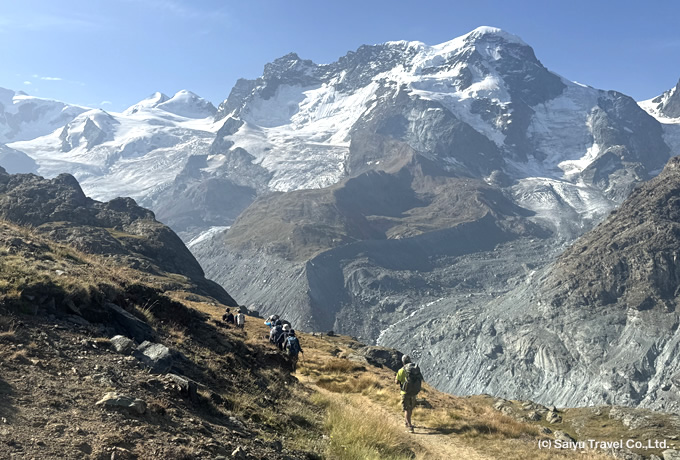 ヨーロッパアルプス第2の高峰モンテローザ(4,634m)。イタリアとスイスの国境に聳え、スイス最高峰でもあります。独立峰ではなく、複数の峰からなる山群で、最高点はイタリア側にあるプンタ・デュフール(Punta Dufour)。起点となるサースフェーからマッターホルンを望むチェルビニアまで、ぐるっと時計回りに巡ります。ツール・ド・モンブラン(TMB)やオートルート(HR)と並んで有名なアルプスのトレッキングルートのツール・ド・モンテローザ(TDM)。歩くルートはイタリアが多いですが、壮大な山岳風景から素朴で可愛らしい山村風景まで、スイス・イタリアアルプスの魅力をぎゅっと凝縮して、比較的参加しやすい12日間日程に仕上げました。
