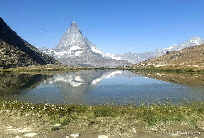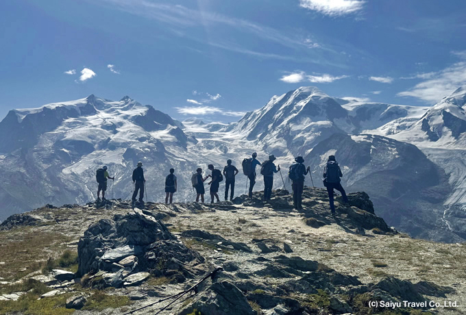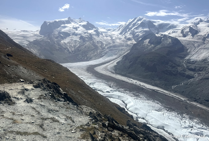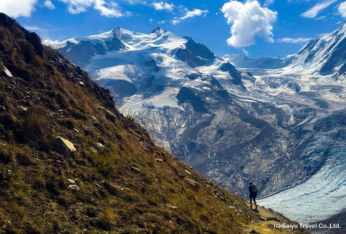 約4時間 | ●ゴルナーグラートハイキング(約4時間) 登山電車でリッフェルベルグ(2,582m)へ。着後、ゴルナーグラート(3,089m)を周遊トレッキング。アルプスで3番目の大きさを誇るゴルナー氷河やフィンデルン氷河、スイス最高峰のデュフール峰を抱くモンテローザ(4,634m)から名峰マッターホルン(4,478m)まで、4000m級の山々が29座も広がる迫力の眺望をご満喫ください。 <10.5km 累積登り730m / 累積下り730m> ツェルマット:エクセルシオール泊