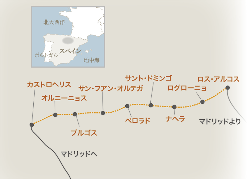 「美食の都」と呼ばれるリオハ州の州都ログローニョ、世界遺産の大聖堂があるブルゴス、“にわとり伝説”の残るサント・ドミンゴ等、各町の魅力も多彩です。