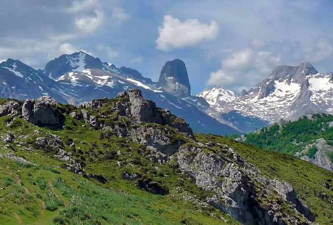 スペイン北部のカンタブリア山脈の中心部、アストゥリアス州、カンタブリア州、レオンの3州の間に位置しています。単独の山ではなく、ピコス・デ・エウロパ山塊にあるトーレ・セレード(2,650m)が山脈の最高峰です。アメリカ大陸からヨーロッパへやってきた船が初めて目にするヨーロッパの光景がこの連山であったから、という説が名前の由来として広く受け入れられています。
