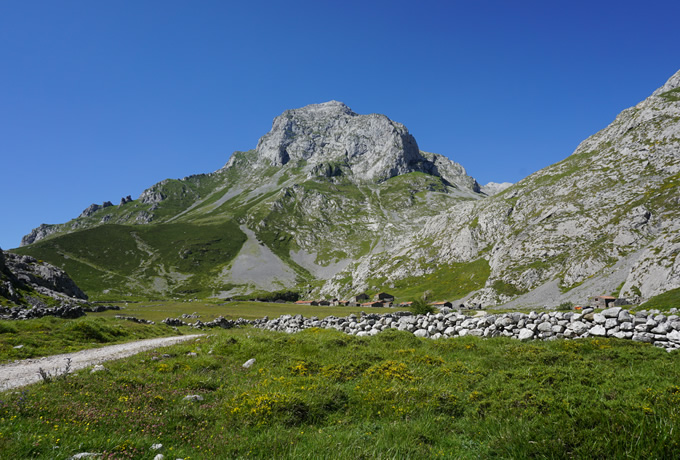 約6時間 | ソトレスから地元の農道をゆっくりと登り、牛小屋を過ぎてパンデバノ峠(1,240m)へ。シャモア(山ヤギ)が生息する細い山道を登り続け、ピコス・デ・エウロパ中央山塊に位置する、クライマーの聖地ピク・ウリエル(別名ナランホ・デ・ブルネス)の山麓にあるベガ・デ・ウリエル小屋を目指します。周辺には、標高差400mを超える石灰岩の山々が間近に迫ります。 ベガ・デ・ウリエル小屋(1,960m)泊 |