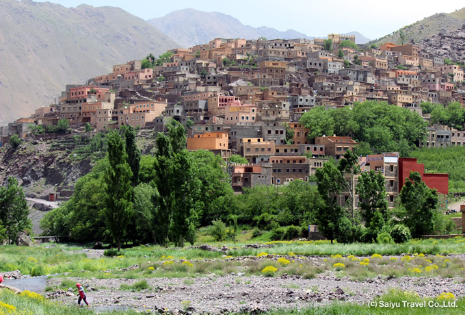 朝、専用車にてオートアトラス山脈内のイムリル村(1,740m)へ。 山小屋泊